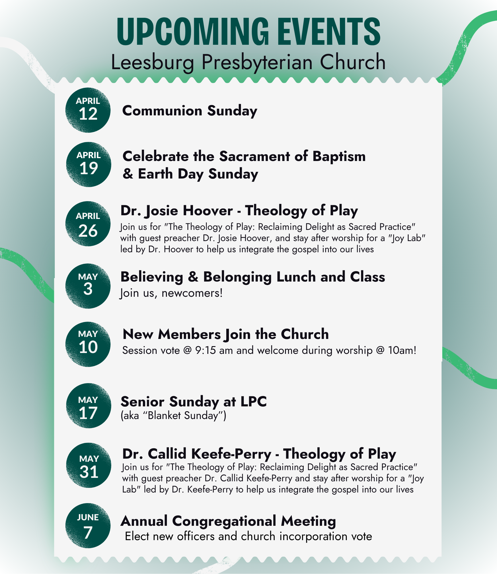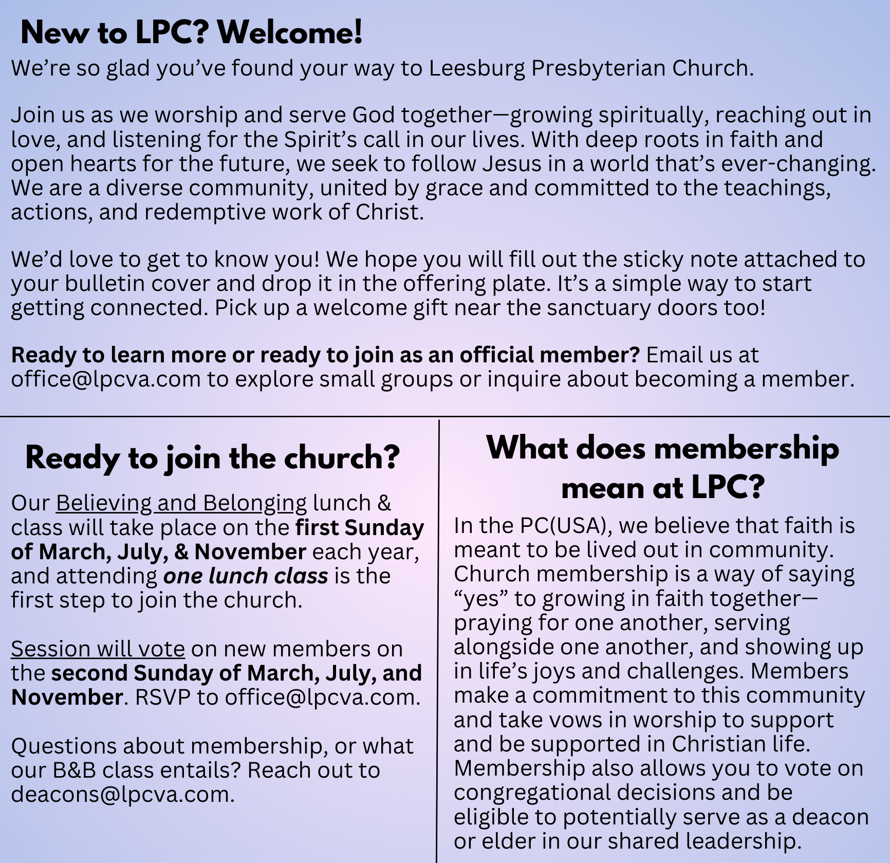Building upon our history of more than 200 years as a Presbyterian Church in Leesburg, we join together as a community of faith to receive and share the grace of our Lord Jesus Christ, the love of God, and the communion of the Holy Spirit. As God’s people in an ever-changing world, we believe God is calling us to be a vibrant congregation of children, youth, and adults where: