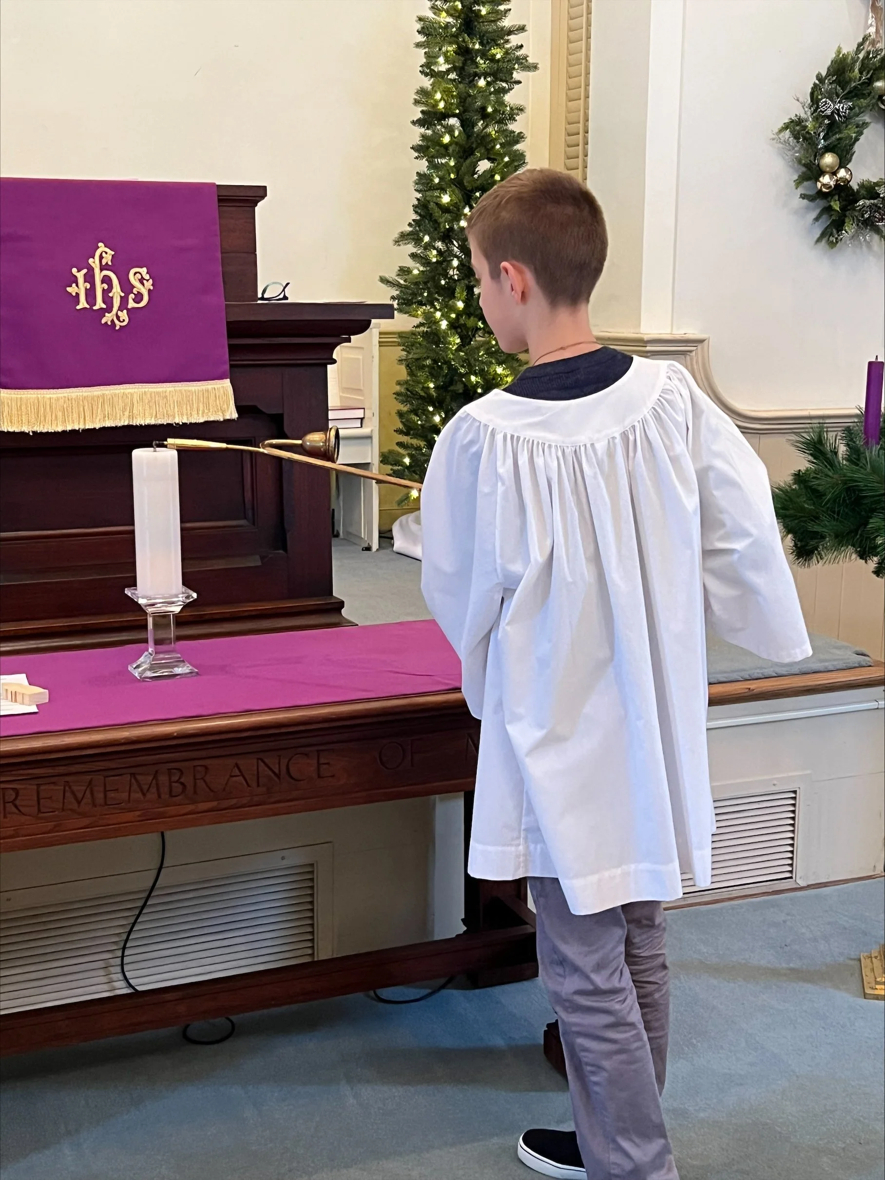 Each Sunday as worship begins, an acolyte lights the Christ candle on the communion table. During the last hymn they extinguish the candle. Acolytes are sometimes asked to do other important tasks, such as carry in a Bible, or baptismal water. Children in fourth through sixth grade may serve as Acolytes if they desire.